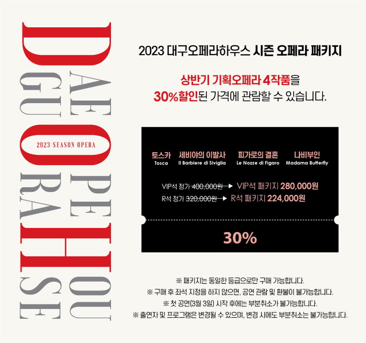 ※ 패키지 : 상반기 오페라 4작품(토스카/세비야의 이발사/피가로의 결혼/나비부인)을 30% 할인된 가격에 관람 가능